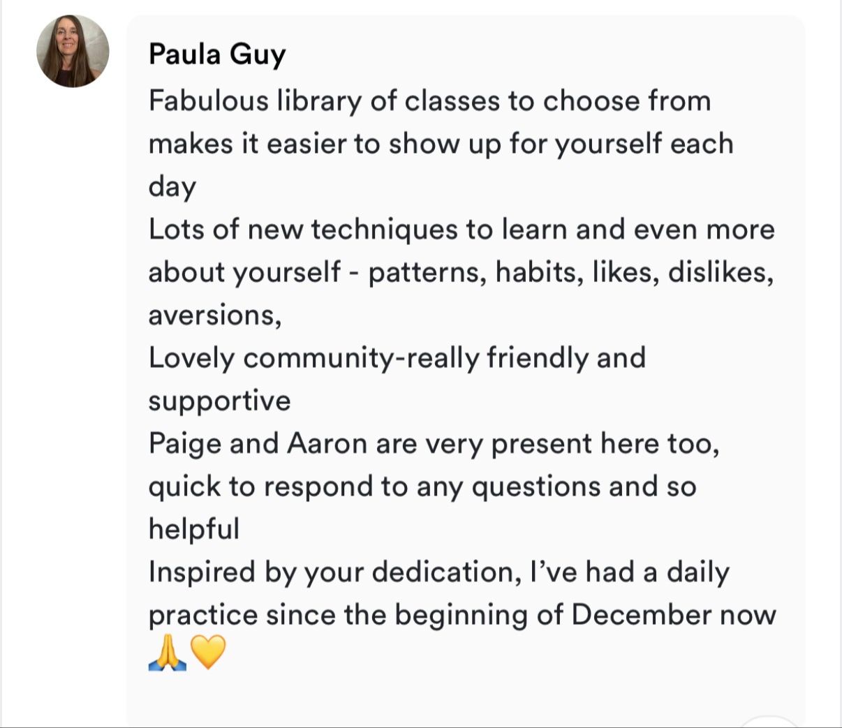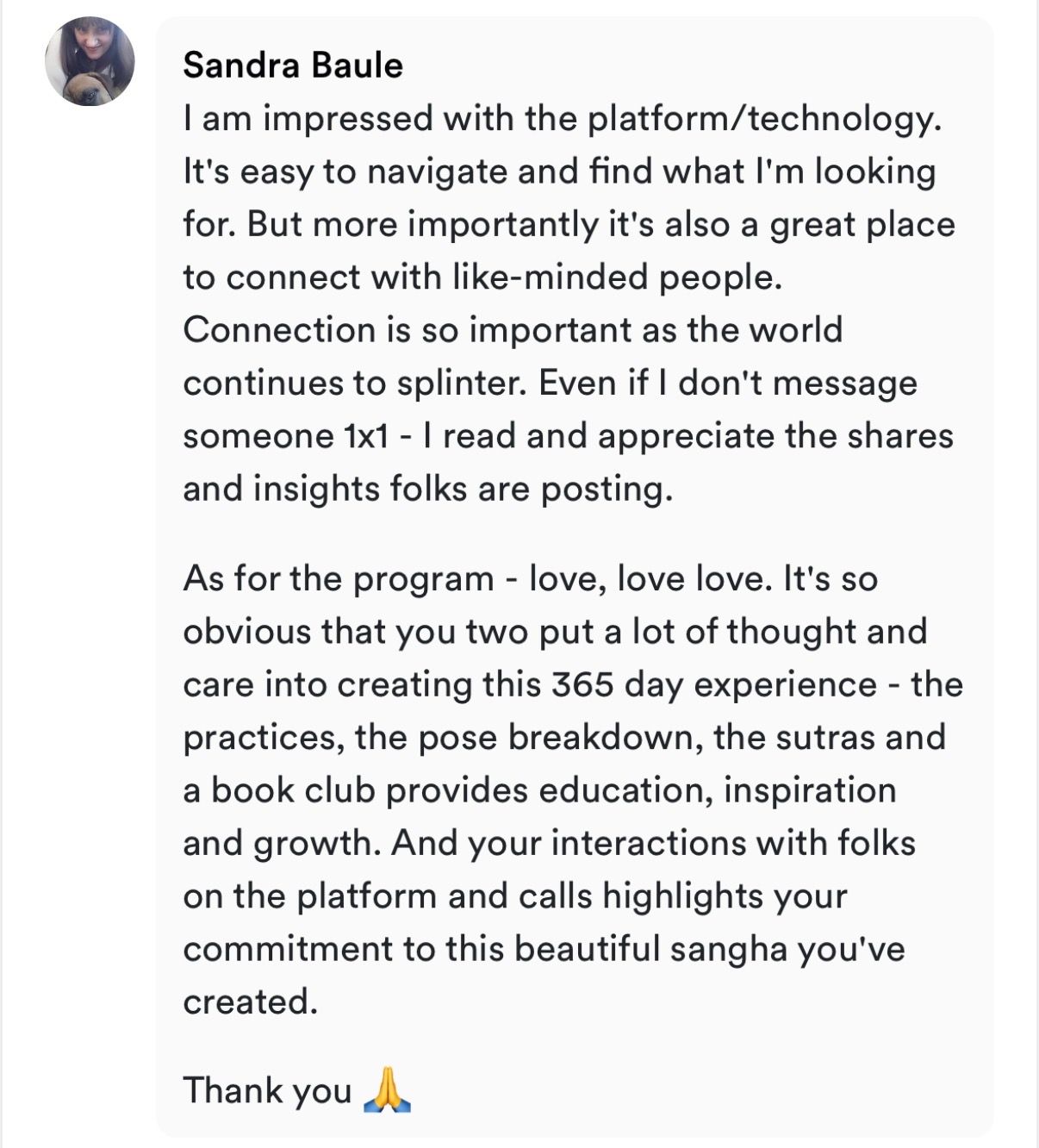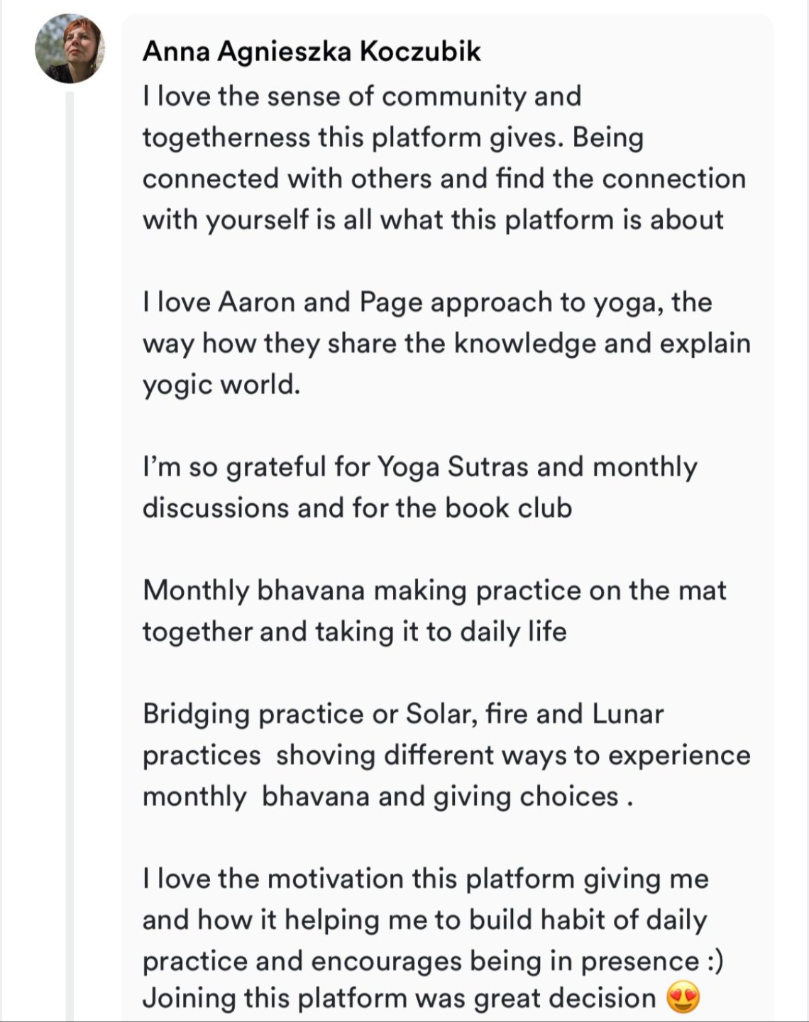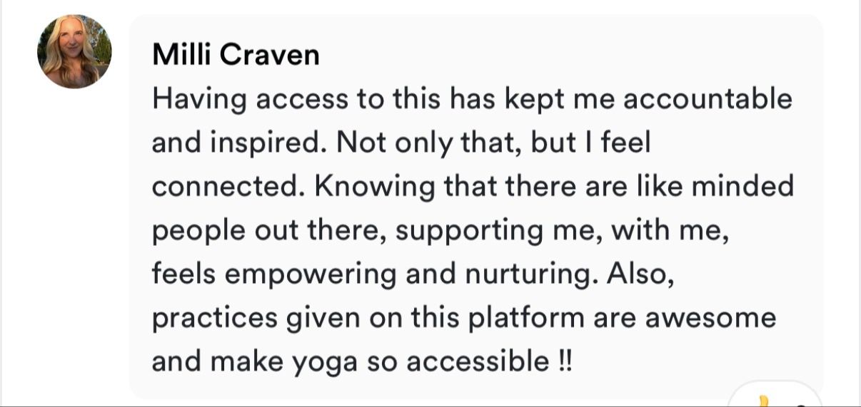 I love the sense of community and togetherness this platform gives. Being connected with others and find the connection with yourself is all what this platform is about I love Aaron and Page approach to yoga, the way how they share the knowledge and explain yogic world. I’m so grateful for Yoga Sutras and monthly discussions and for the book club Monthly bhavana making practice on the mat together and taking it to daily life Bridging practice or Solar, fire and Lunar practices shoving different ways to experience monthly bhavana and giving choices . I love the motivation this platform giving me and how it helping me to build habit of daily practice and encourages being in presence :) Joining this platform was great decision 😍