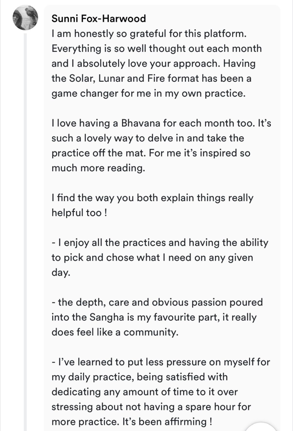 I am honestly so grateful for this platform. Everything is so well thought out each month and I absolutely love your approach. Having the Solar, Lunar and Fire format has been a game changer for me in my own practice. I love having a Bhavana for each month too. It’s such a lovely way to delve in and take the practice off the mat. For me it’s inspired so much more reading. I find the way you both explain things really helpful too ! - I enjoy all the practices and having the ability to pick and chose what I need on any given day. - the depth, care and obvious passion poured into the Sangha is my favourite part, it really does feel like a community. - I’ve learned to put less pressure on myself for my daily practice, being satisfied with dedicating any amount of time to it over stressing about not having a spare hour for more practice. It’s been affirming ! Thanks so much guys, honestly really loving it all !